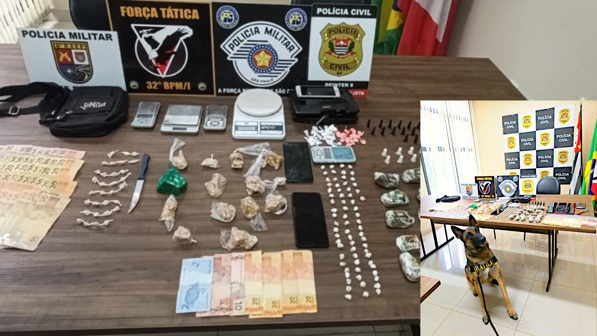 O apoio do Canil do BAEP foi decisivo para o desfecho da operação. A cadela farejadora Rayka foi empregada nas diligências e indicou a presença de drogas escondidas debaixo de uma cama em um dos imóveis. No local apontado pelo animal, os policiais encontraram diversas porções de maconha a granel, já embaladas e prontas para a venda. O responsável foi conduzido pela Polícia Civil.