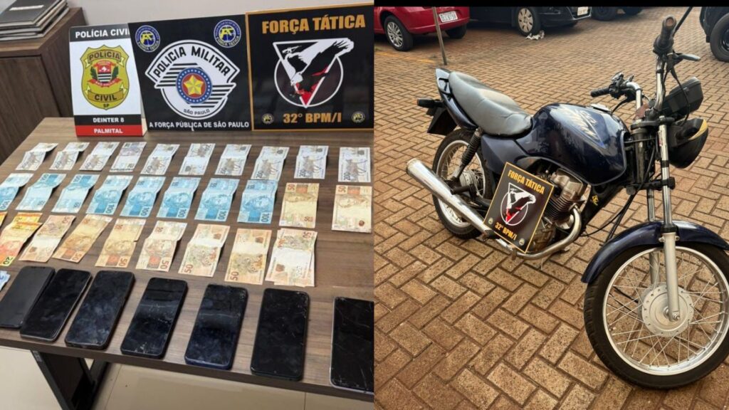 Durante as diligências, os agentes encontraram R$ 3.250 em espécie e uma motocicleta Honda/Titan azul, com chassi adulterado e placa trocada, confirmando tratar-se de veículo produto de crime. Também foram apreendidos cinco celulares, dois deles sem comprovação de origem. O suspeito foi autuado em flagrante e levado à unidade policial.